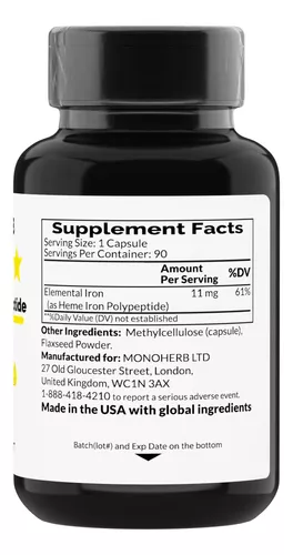 Heme Iron Polipéptido de Hierro 11 mg 90 capsulas Monoherb