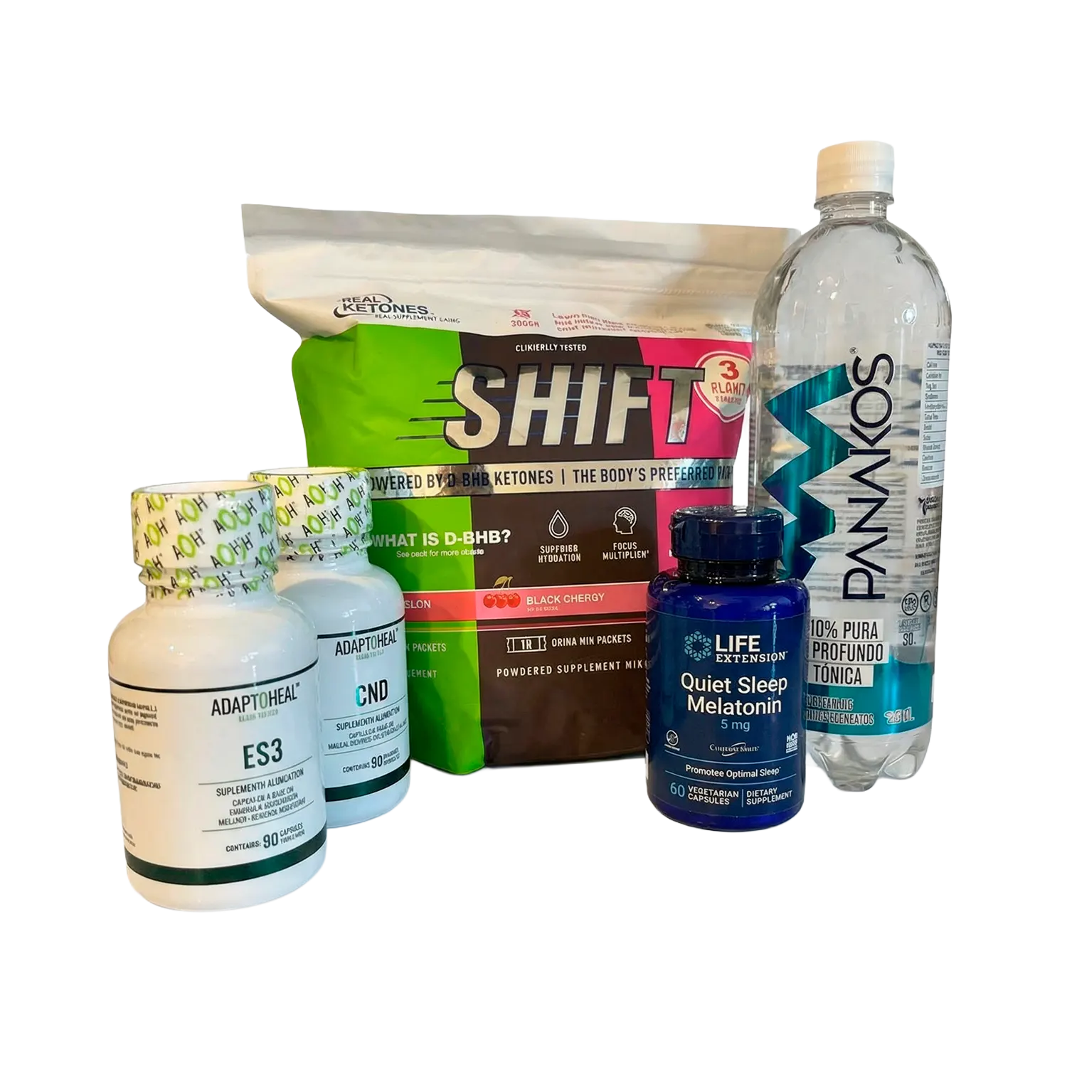 Powered D-BHB Ketonas SHIFT 30 paquetes Agua de Mar Profundo (1L) Panakos Quiet Sleep Melatonin (5mg) Life Extension CND 90 capsulas Adaptoheal ES3 90 capsulas Adaptoheal